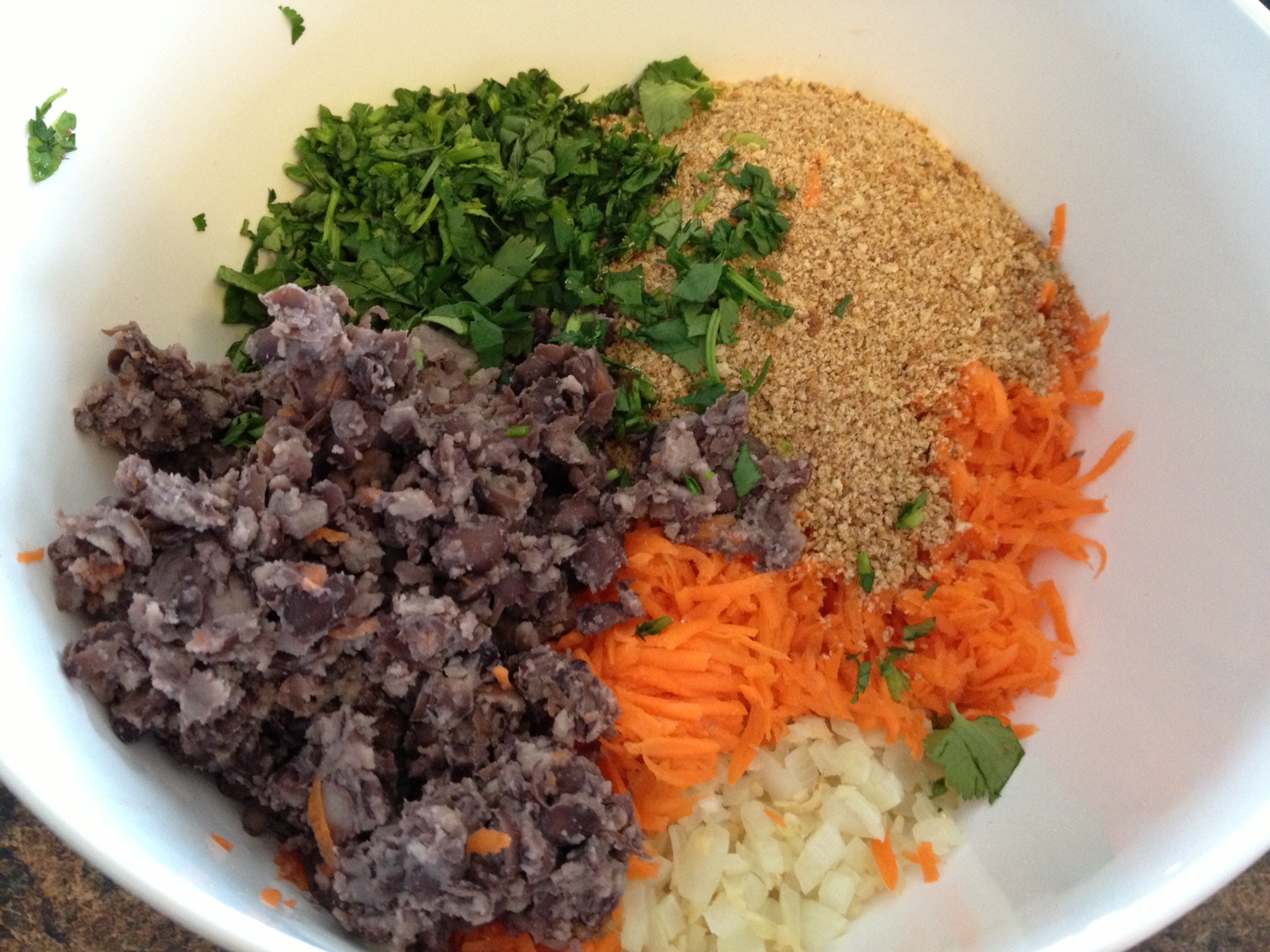 - Place sautéed vegetables, eggs, flour, breadcrumbs, carrots, beans, cilantro, almonds, sunflower seeds and soy sauce into a large mixing bowl and stir very well. Add chili powder, cumin, oregano, salt and pepper. Stir to combine.