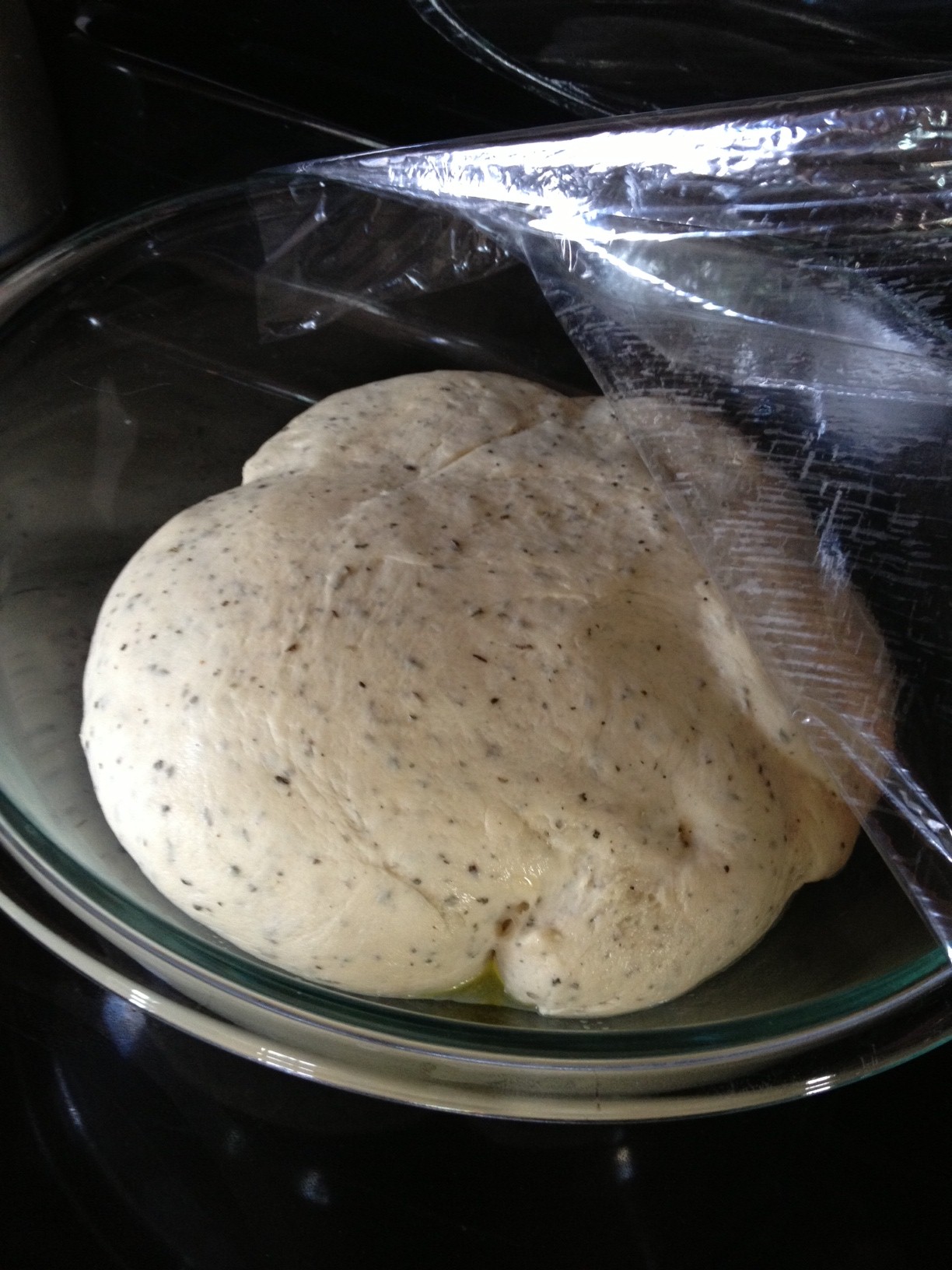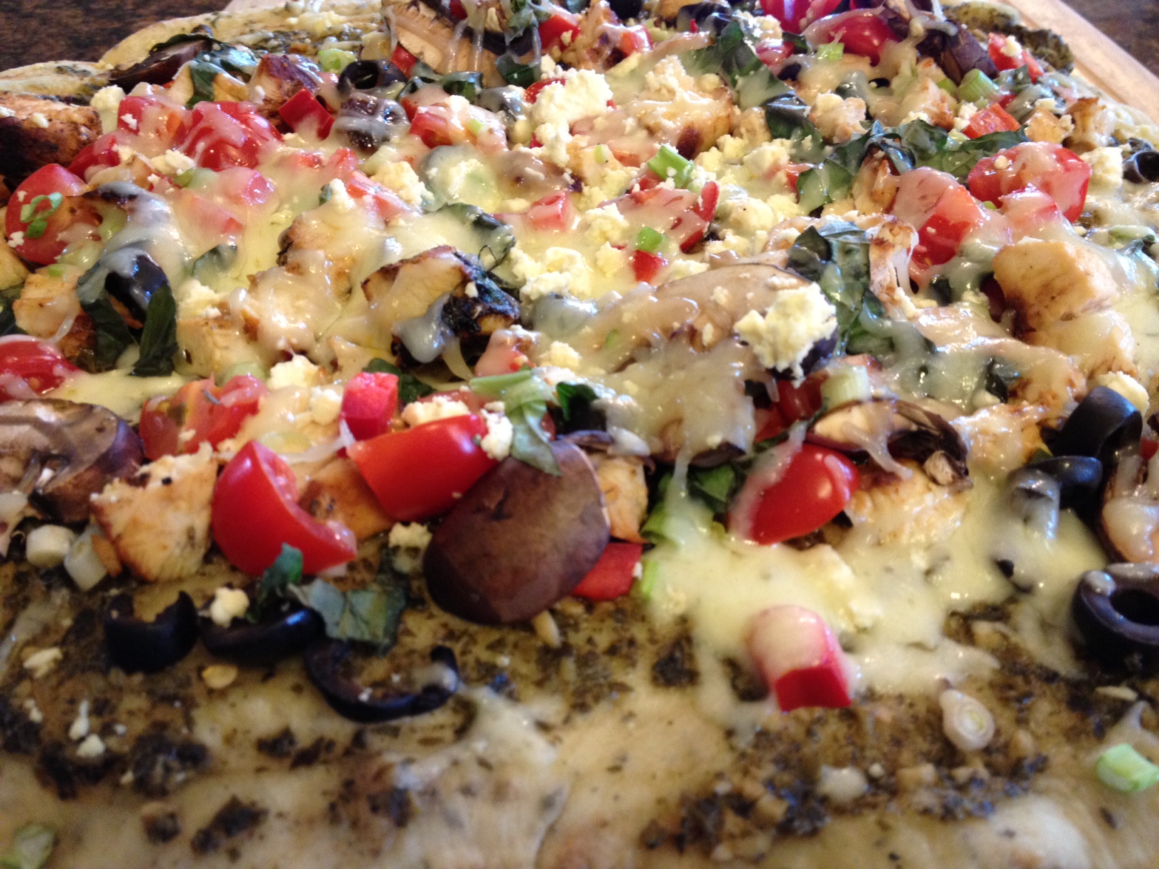 To make our crust, we started with pesto rather than a red sauce. Then topped it with tomato basil marinated chicken breasts, red peppers, green onions, black olives, mushrooms, fresh basil, feta and mozzerella cheese. To say that this pizza was delicious is an understatement. The crust recipe makes enough for two pizzas and my family eats 1 pizza at a meal. So we were all looking forward to leftovers the next day.