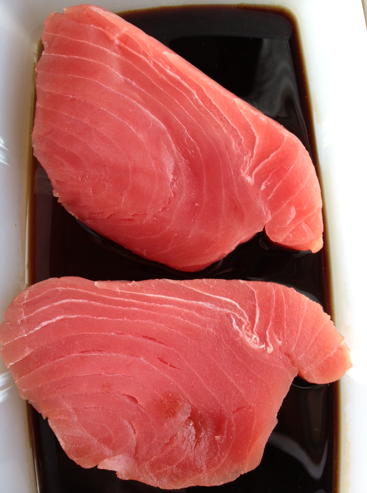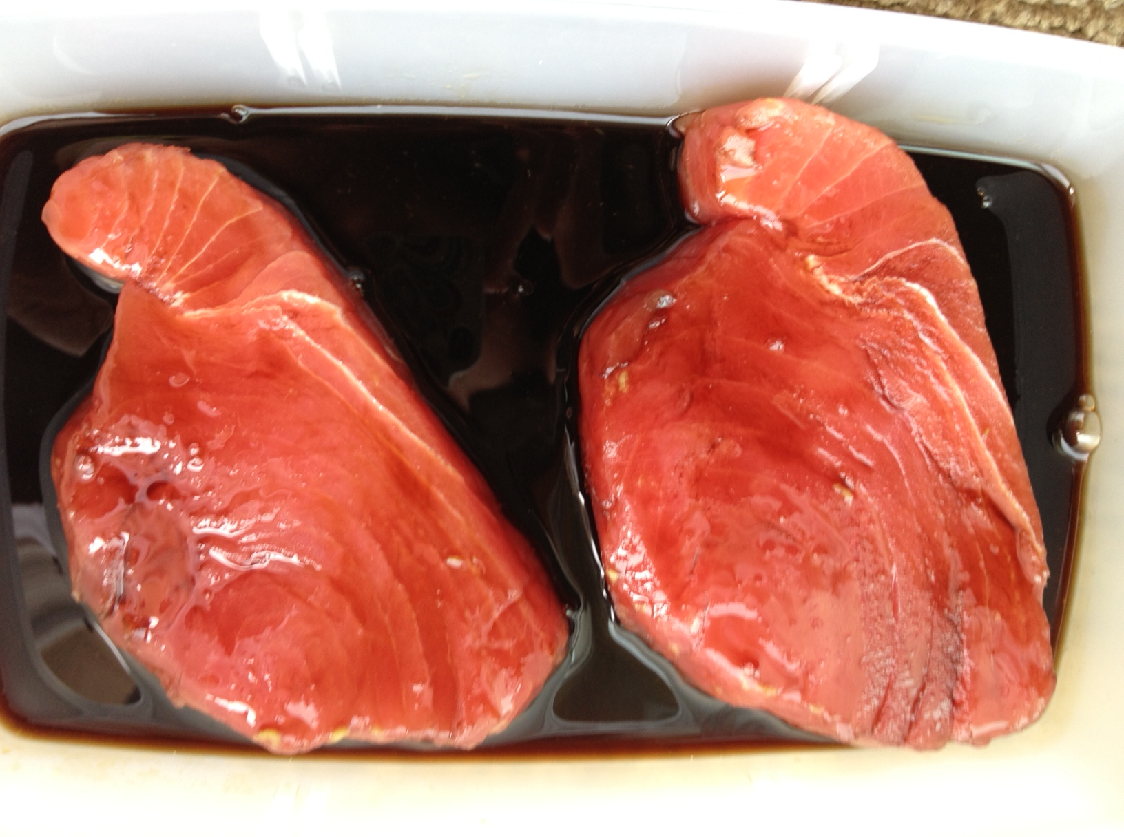 To make, mix up the marinade (honey, soy sauce and wasabi). Reserve 1/4 cup for dipping sauce. Marinate the tuna steaks in the marinade overnight.