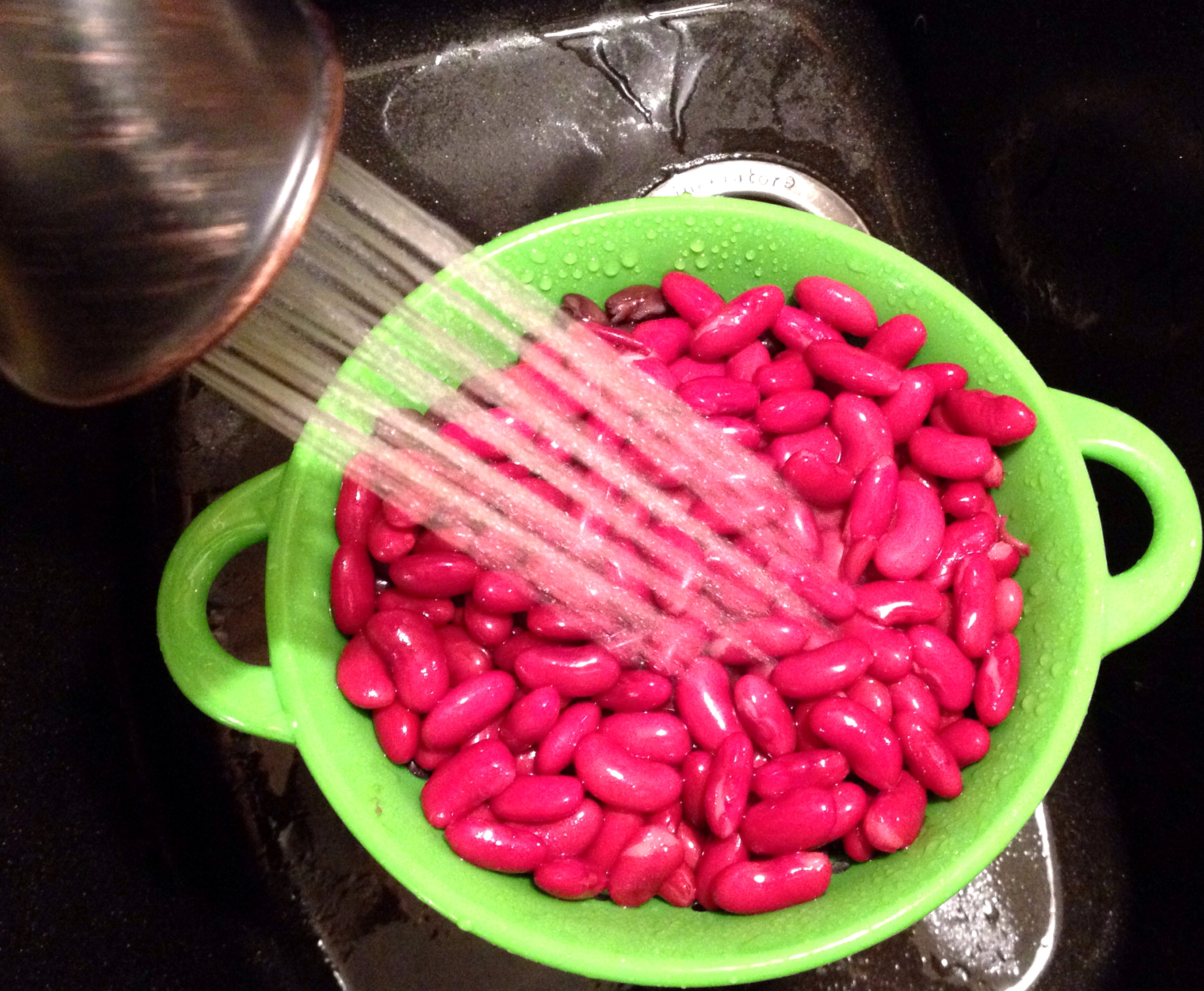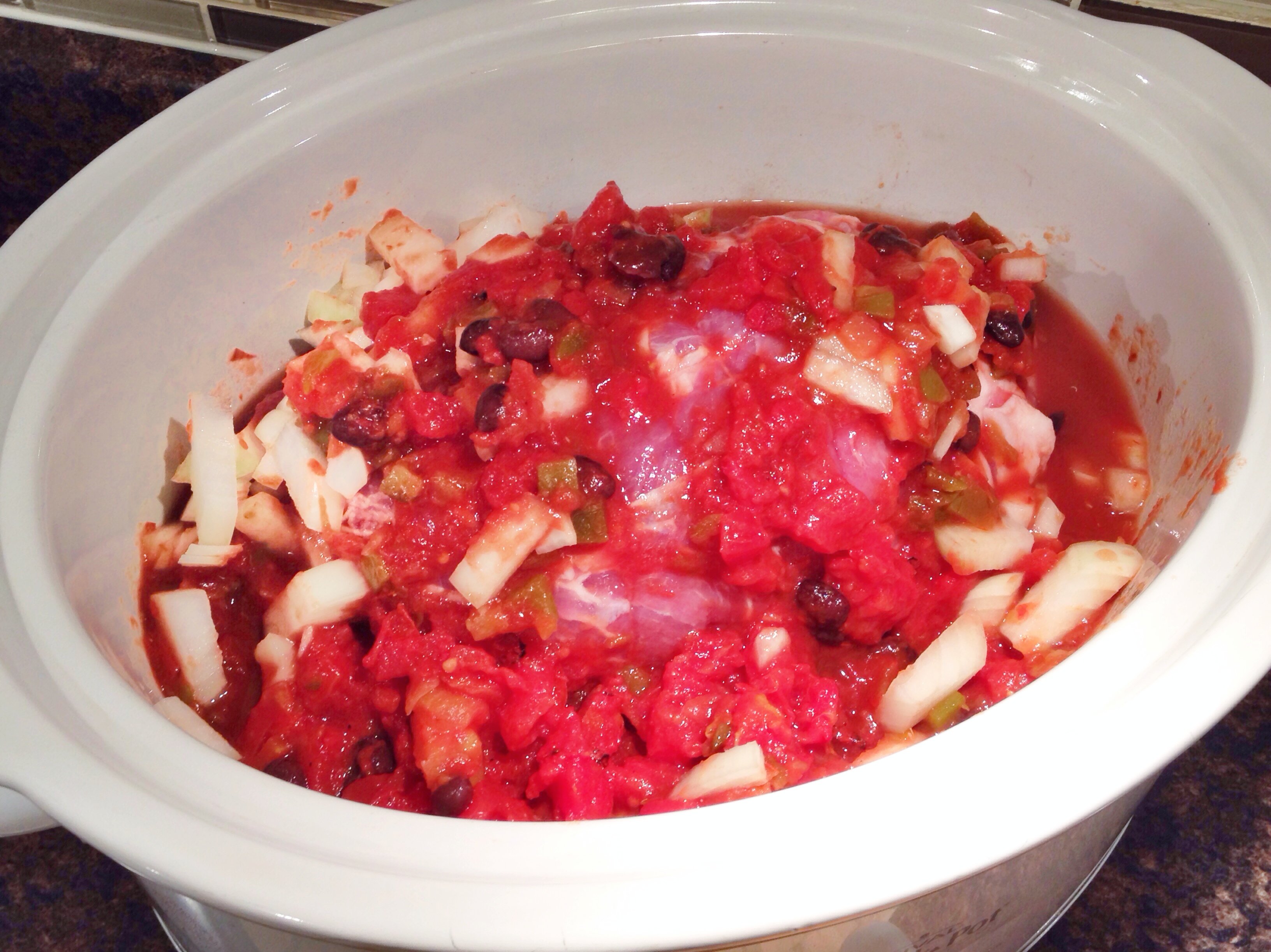 To your 5-6 quart crock pot, add a 2-3 pound pork roast and 3 cans of beans. Any variety will do. I typically add black beans, but today I only had 2 cans on hand so I threw in 1 can of kidney beans. Make sure to rinse and drain your beans. *Health note: rinsing and draining your beans lowers the salt by 40%!