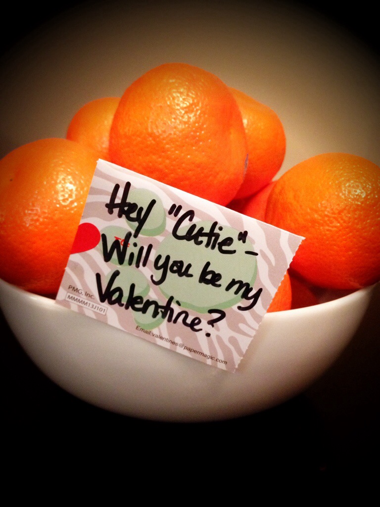 In anticipation of a busy week ahead, we made our valentines tonight. The winning treat? Cutie clementines – one of my kids’ favorites!