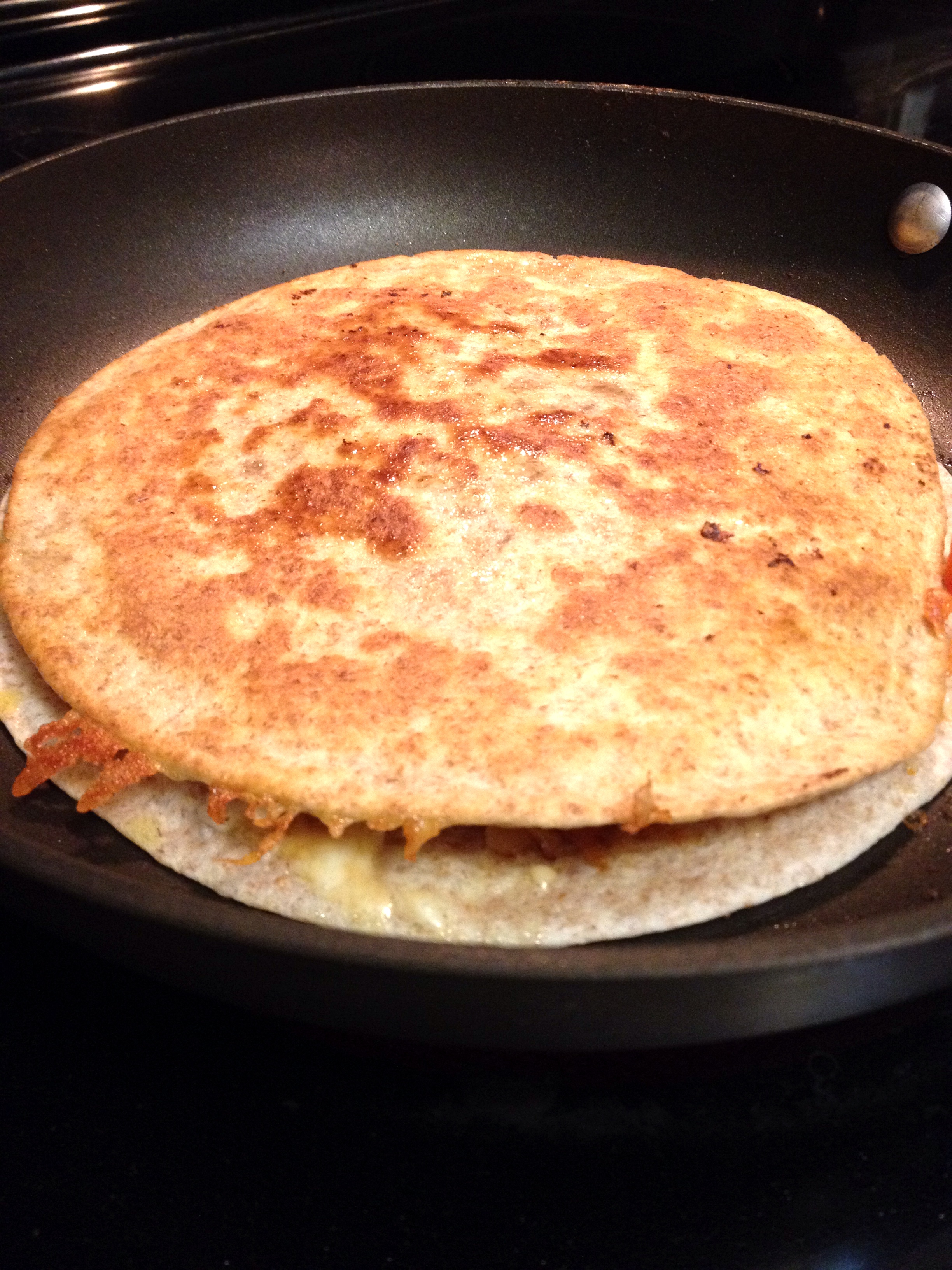 They key to a delicious quesadilla is to spray your pan with non-stick spray. This will give you an extra-crispy crust (instead of a hard, dried out crust). To make, simply spray pan (preheated over medium-high heat), lay a whole wheat tortilla in the pan, layer desired ingredients (don’t forget the cheese) and top with a second tortilla. Cook for 3-4 minutes (or until golden brown). Lift up quesadilla, re-spray pan, then flip tortilla to cook the other side.