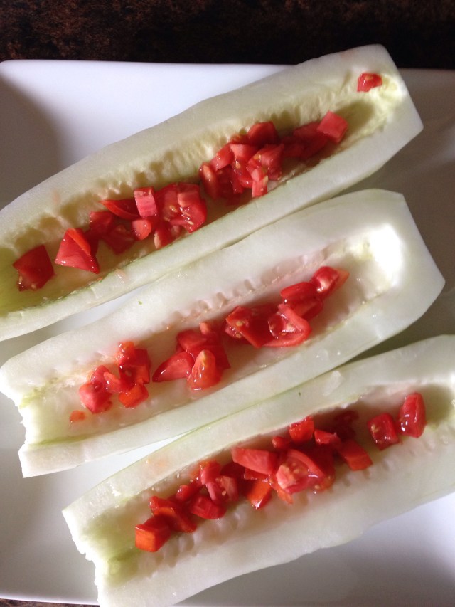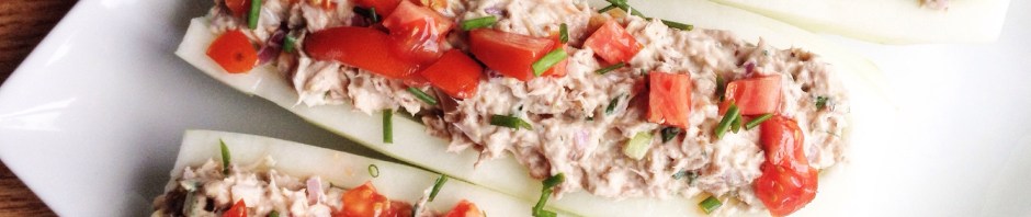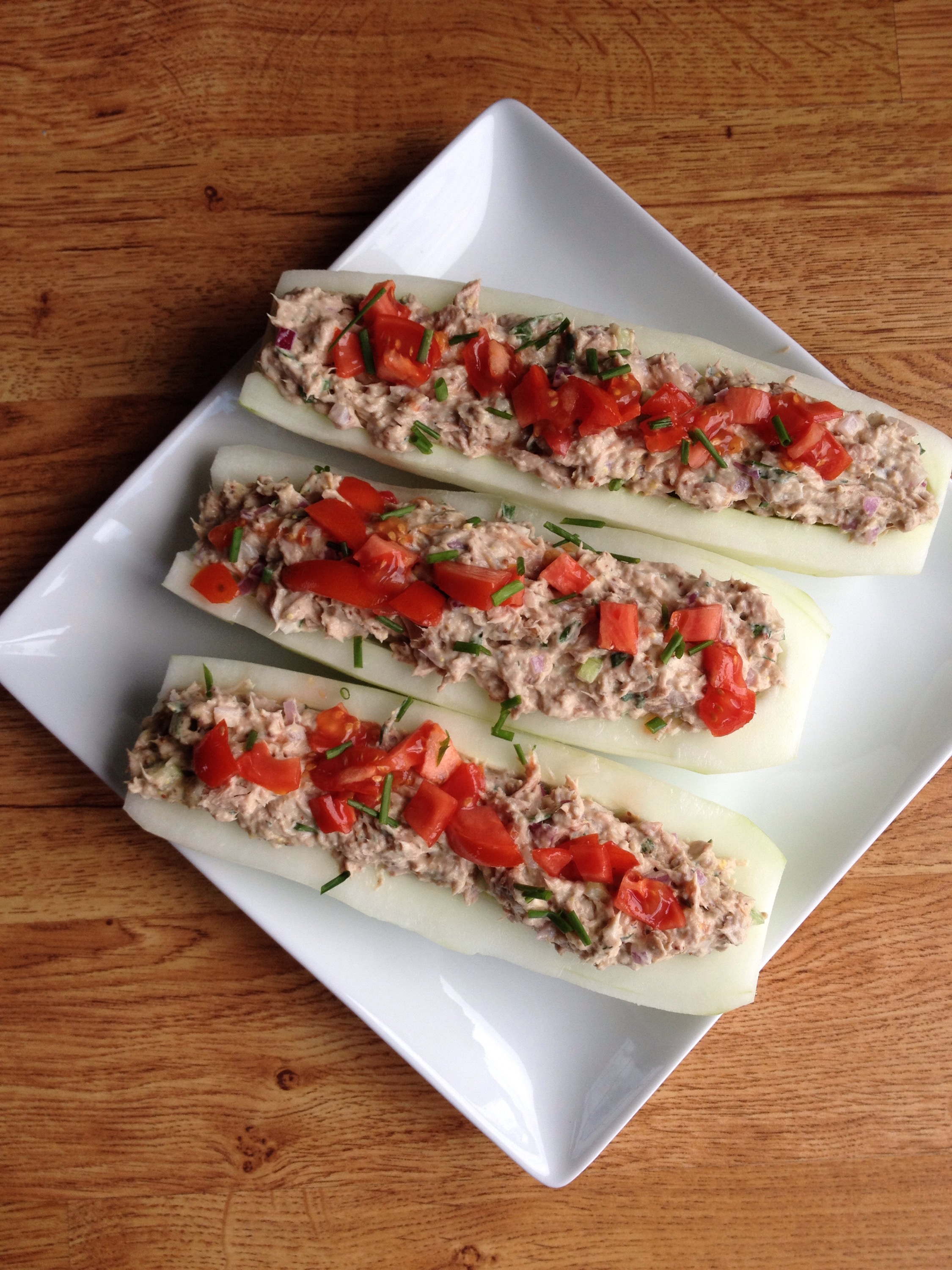 Preparation is simple. Make your favorite tuna salad recipe. Take a cumber (or 2 or 3 or 4!), peel it, and scoop the seeds out (this creates a little boat for your tuna salad to sit in).