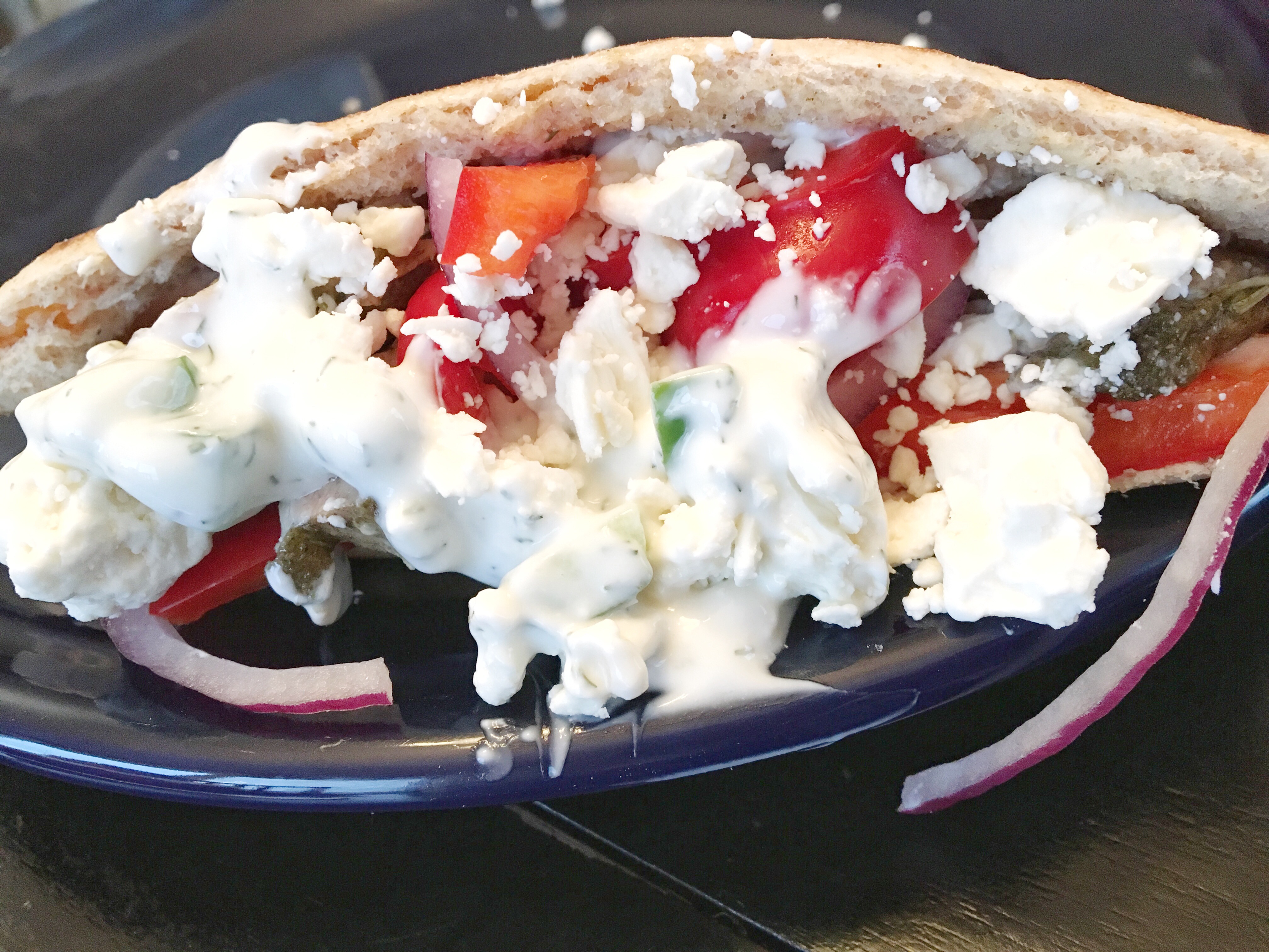 4. Plate the meal. Arrange one pita on each plate. Gently open the pita pocket. Add chicken, red pepper strips and onions. Top with tzatziki sauce and feta.