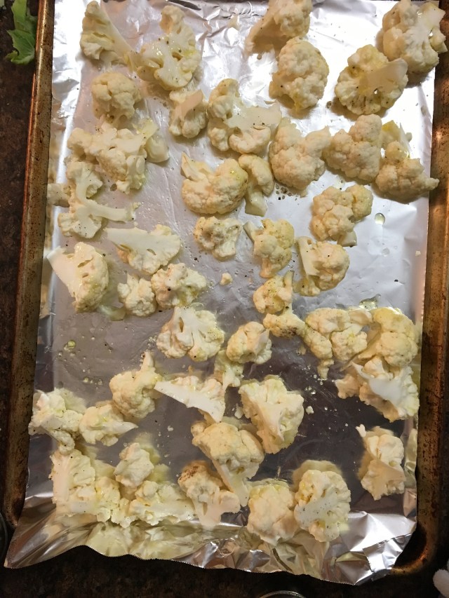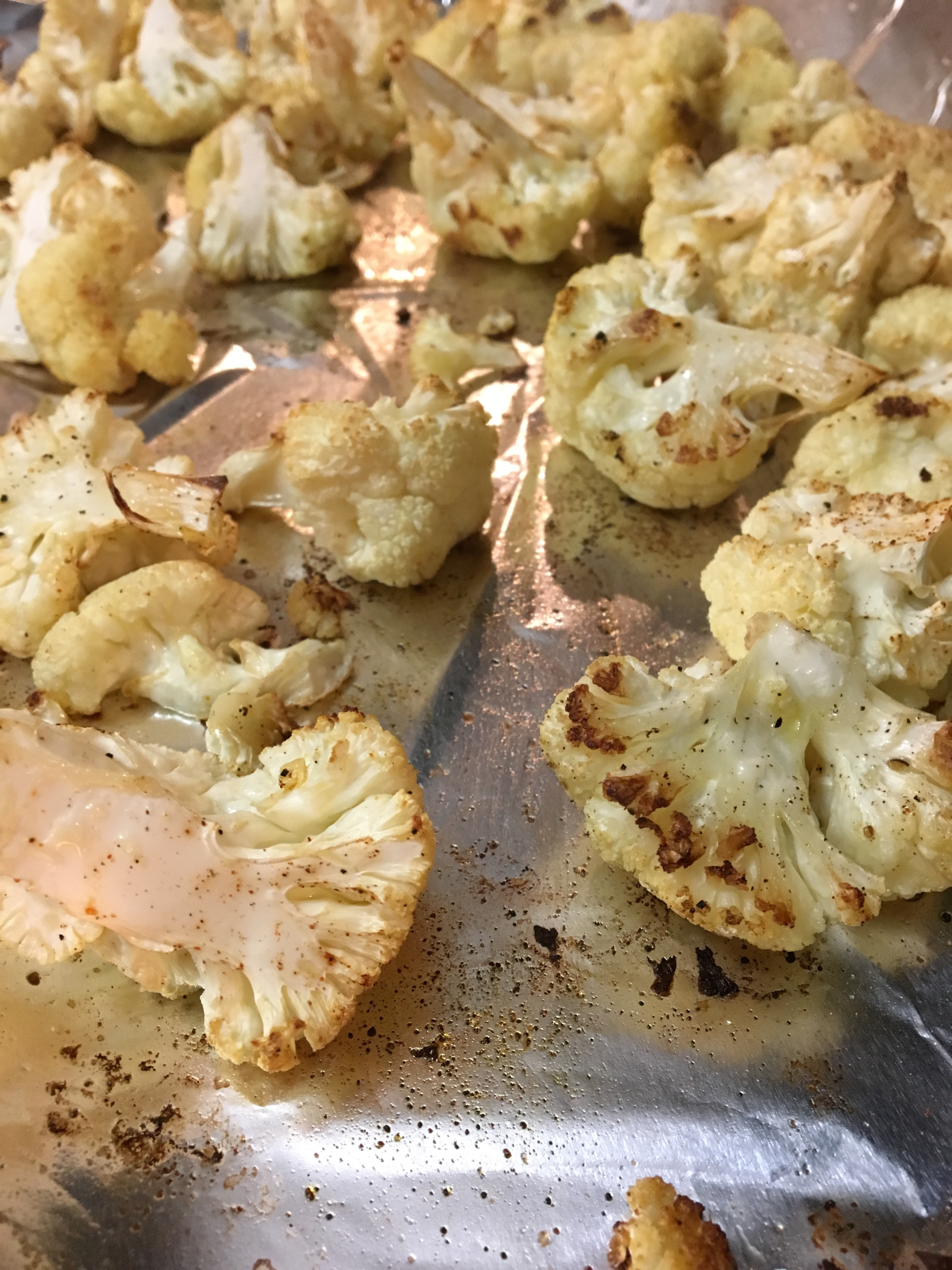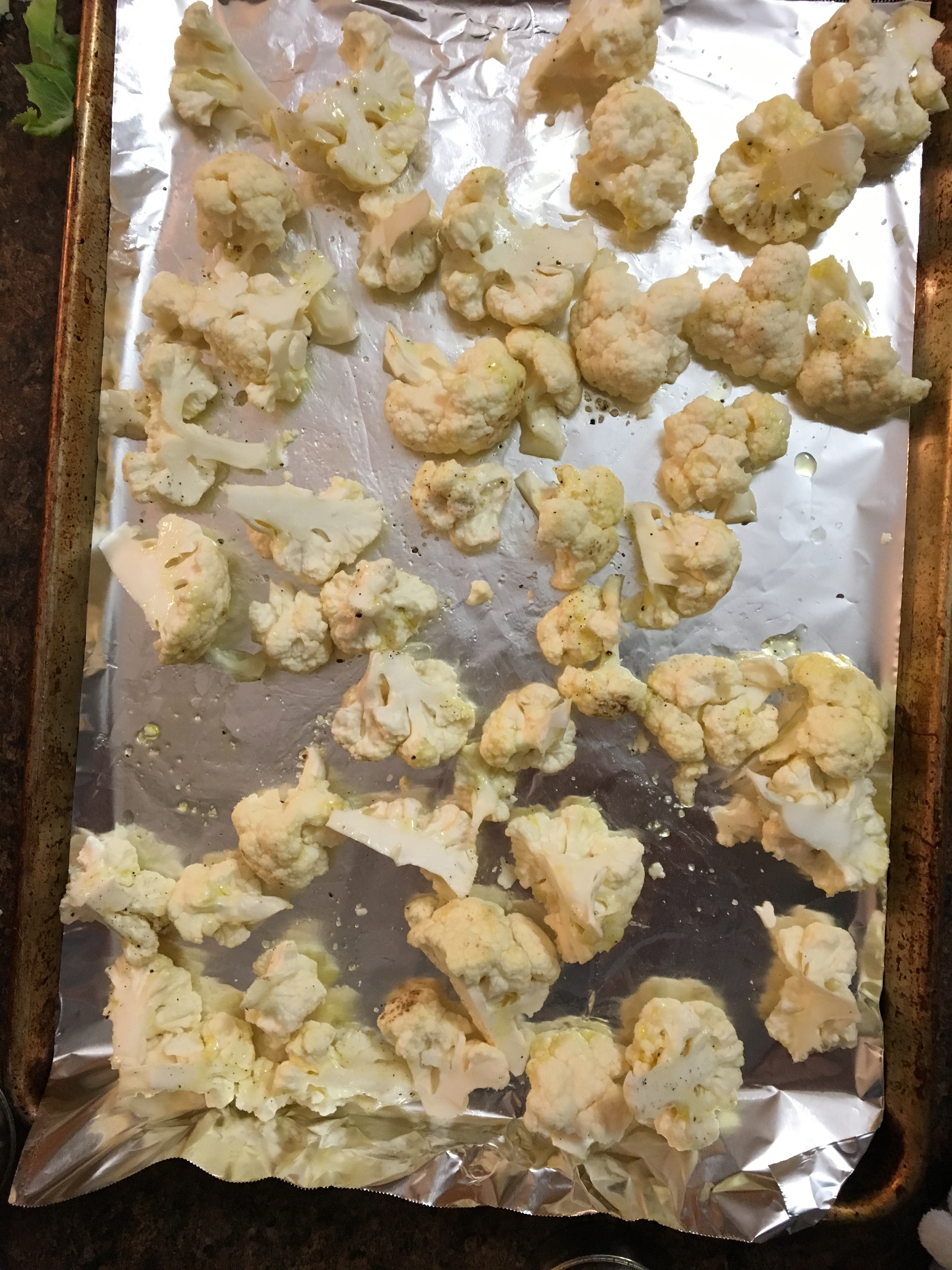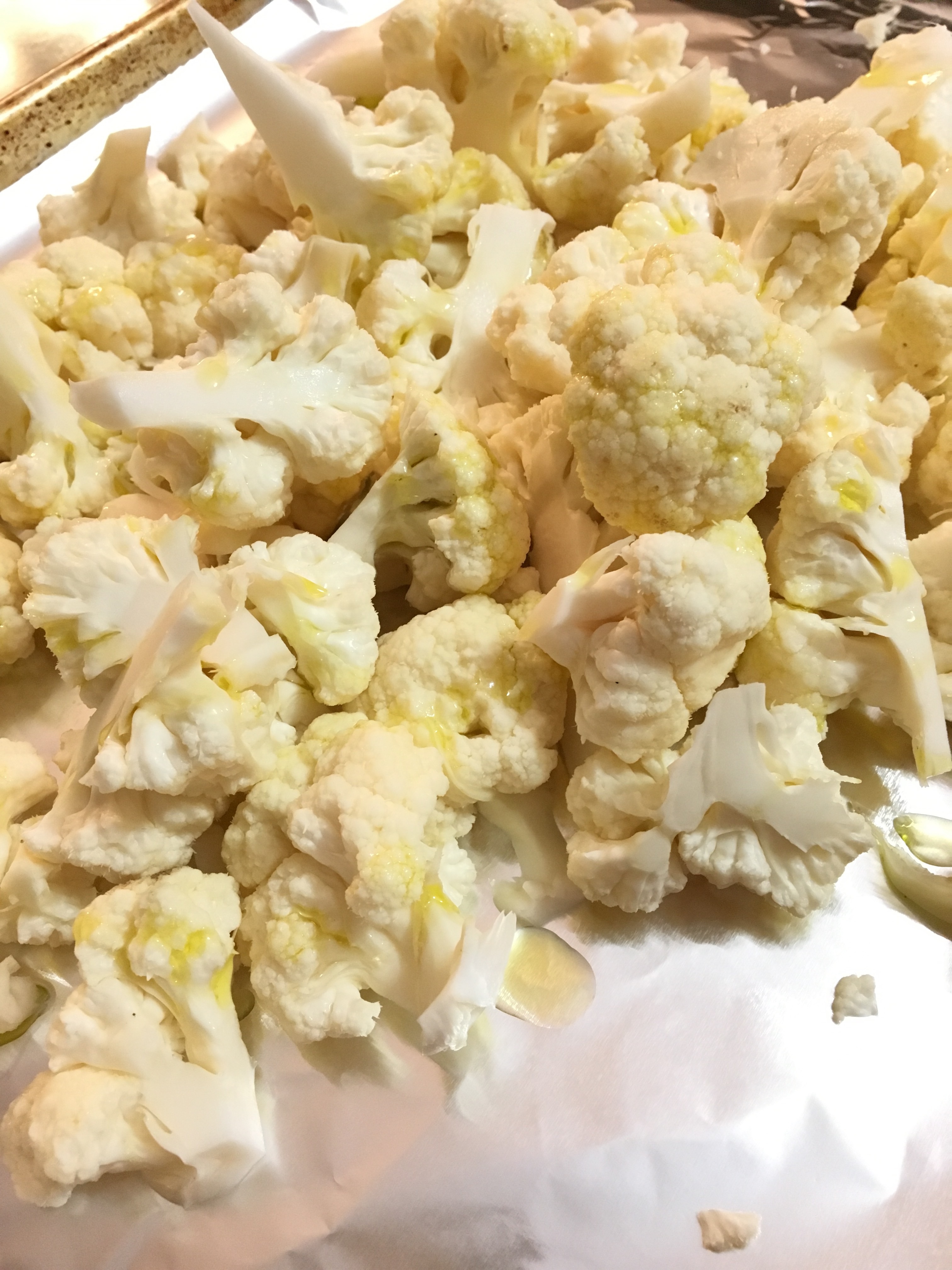 All you do is cut up your cauliflower, drizzle with a little olive oil, salt, pepper or any other spices you enjoy (we love smoked paprika), roast in a hot oven (425 degrees) for about 30 minutes, flipping halfway through. Make sure to leave plenty of room on the pan so that the cauliflower roasts instead of steams. Overcrowding causes soggy vegetables. (And no one likes soggy vegetables.)
